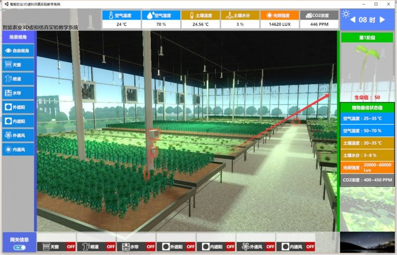 在平臺的右側(cè),虛擬了一個植物,上方點擊按鈕可以調(diào)整時間的流逝,植物會根據(jù)時間流逝進行生長,生長過程中植物對環(huán)境的需求會產(chǎn)生變化。學生可以先了解植物生長的需求,然后根據(jù)植物的需求來編寫上位機控制程序,通過上位機程序?qū)υO(shè)備的控制來改變大棚內(nèi)的環(huán)境參數(shù),達到植物生長的最佳環(huán)境。
